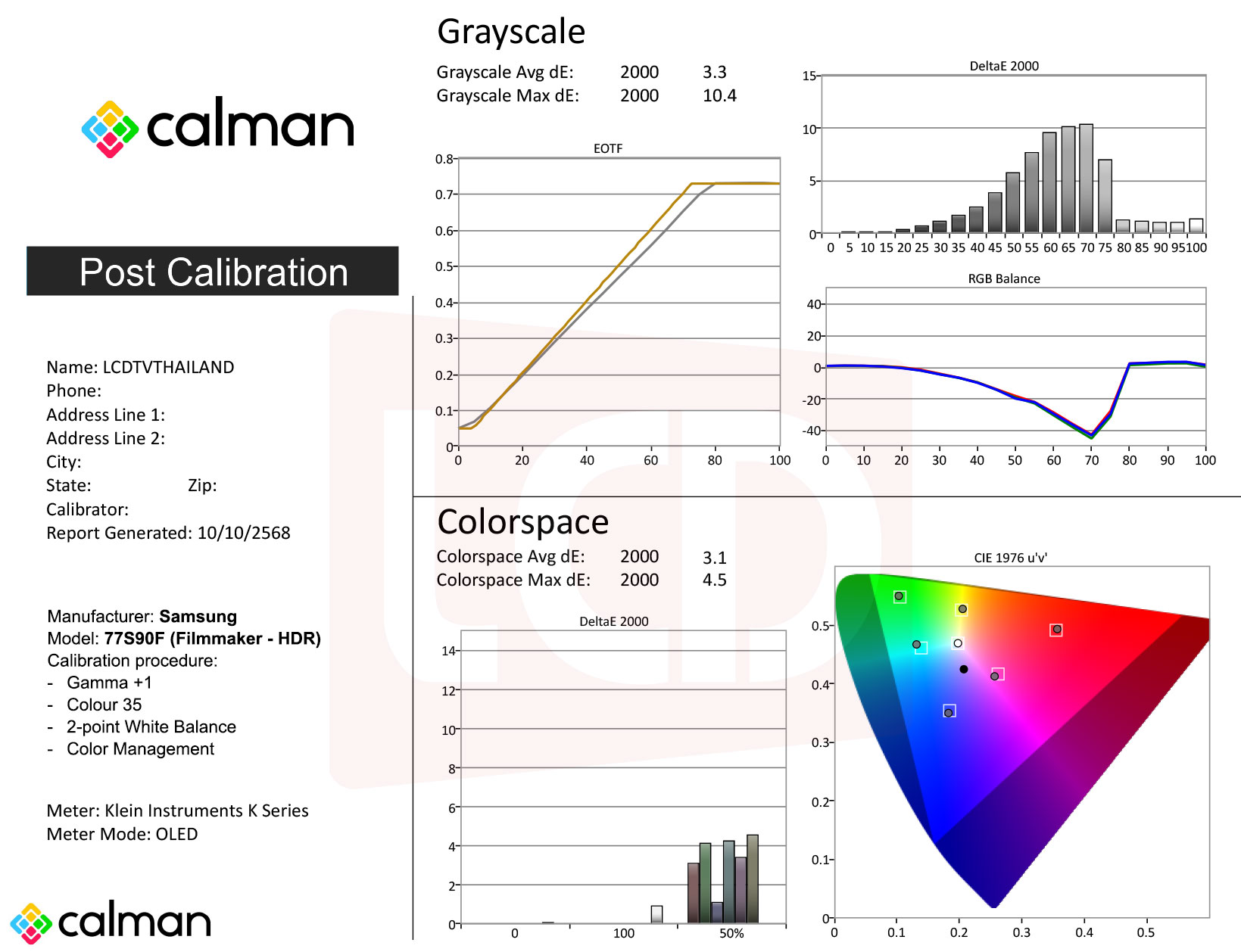 หลังปรับภาพ ค่าความผิดเพี้ยนสมดุลแสงขาว (Grayscale Avg dE) และค่าความผิดเพี้ยนสี (Color Space Avg dE) ลดต่ำลงมาเหลือเพียง 0.9 และ 0.6 ตามลำดับ