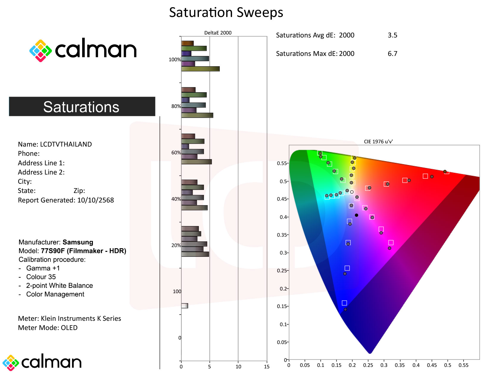 โหมดภาพ Movie (หรือ Filmmaker Mode ที่ Off – Brightness Optimisation) ของ 77S90F มีความเที่ยงตรงของสีสันอยู่ในเกณฑ์ดี อุณหภูมิสีเฉลี่ยอยู่ที่ราว 6795K ค่าความผิดเพี้ยนสมดุลแสงขาวเฉลี่ย (Grayscale Avg dE) 3.1 ในส่วนขอบเขตสีอิงมาตรฐาน Rec.709 มีค่าความผิดเพี้ยน (Color Space Avg dE) 2.1