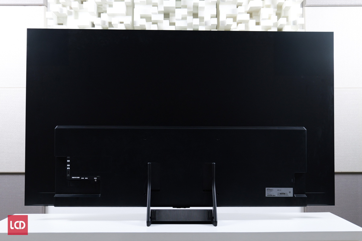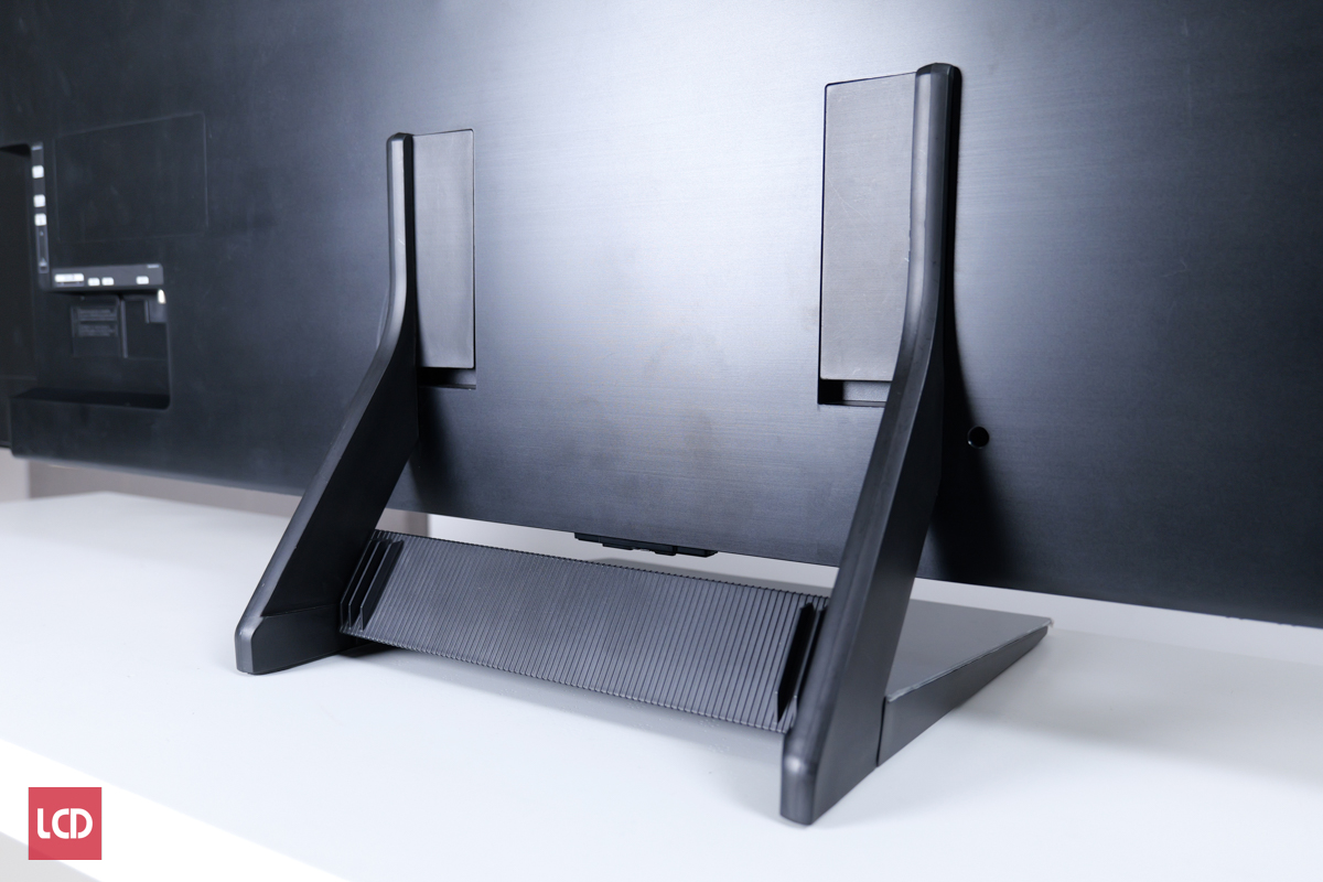 ขาโลหะคู่ตั้งรับที่กึ่งกลางจอ มีฝาครอบพลาสติกปิดด้านบนเพื่อความเรียบร้อย เว้นความสูงให้วางซาวด์บาร์ใต้จอได้
