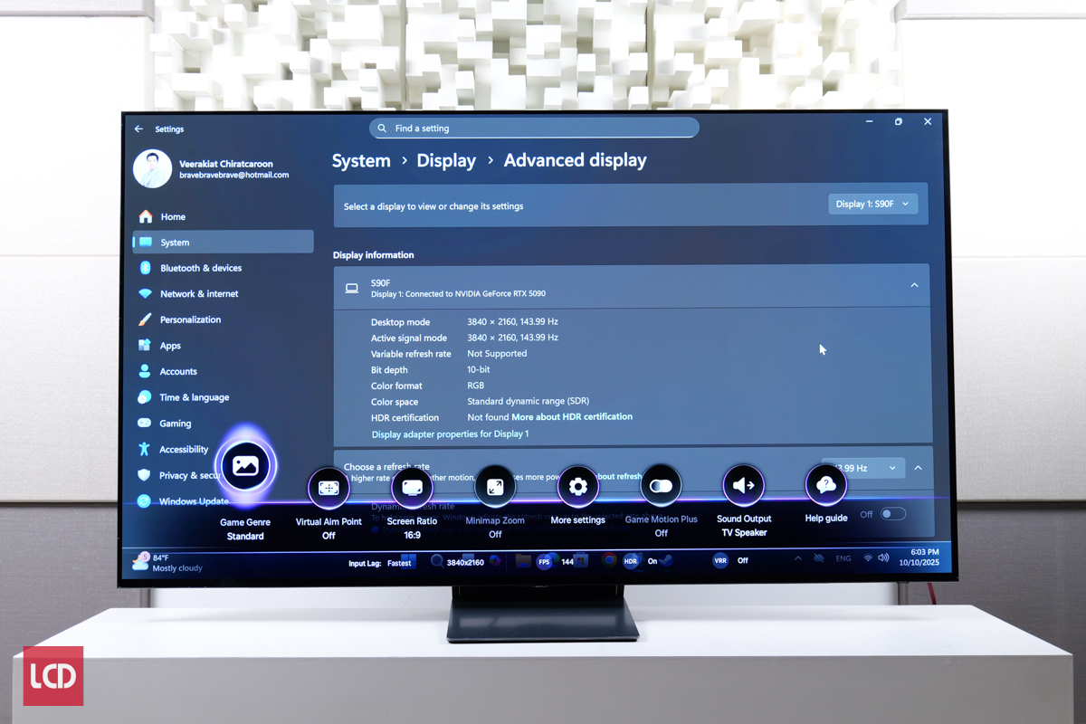ทดลองเชื่อมต่อสัญญาณกับ PC ยืนยันว่า 77S90F รองรับ 4K 144Hz พร้อม VRR ได้จริง หากต้องการ สามารถกำหนด Refresh Rate อื่น ๆ อาทิ 60Hz, 120Hz ได้