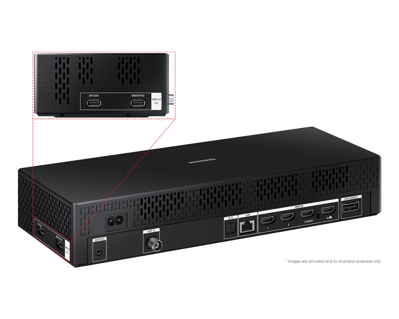 * One connect box กล่องที่เชื่อมต่อ The Frame ไปยังอุปกรณ์เสริมต่างๆ อย่างสะดวกสบาย ช่วยซ่อนสายไฟให้พ้นสายตาได้อย่างแนบเนียน